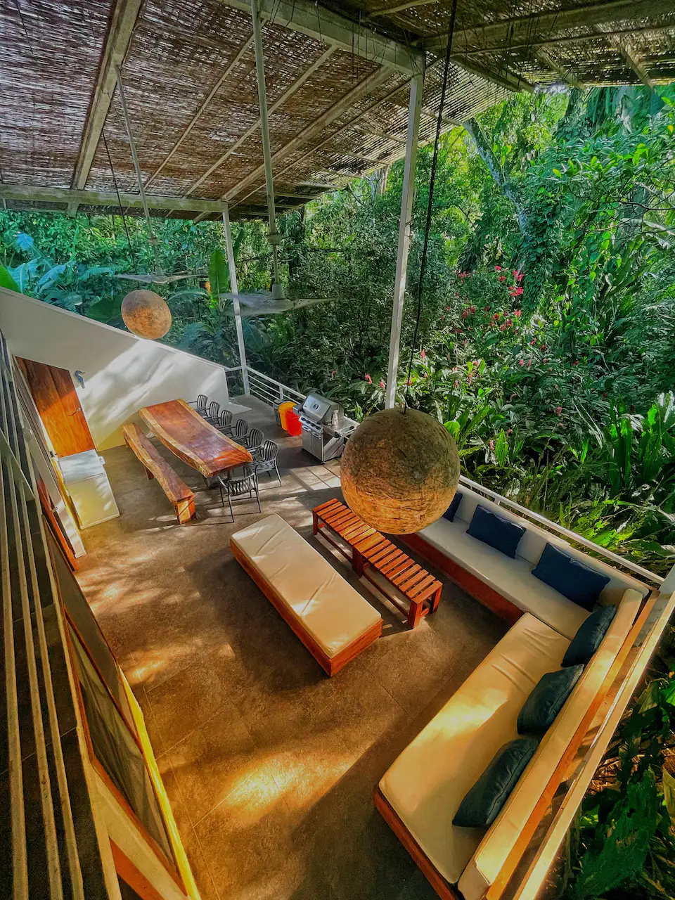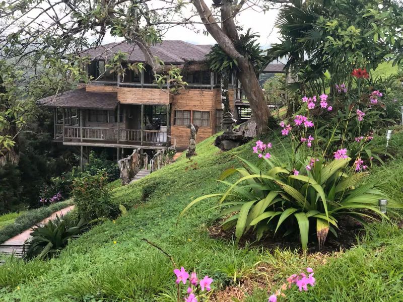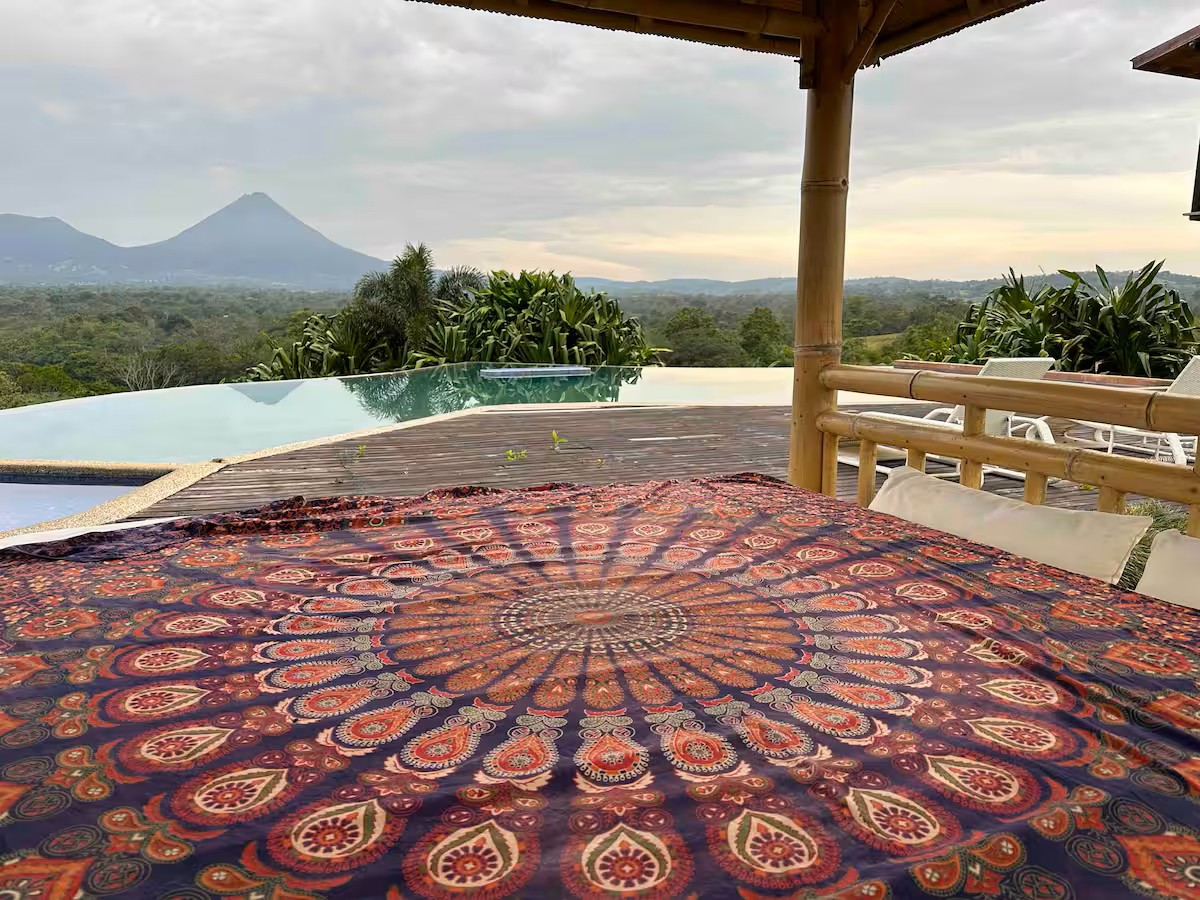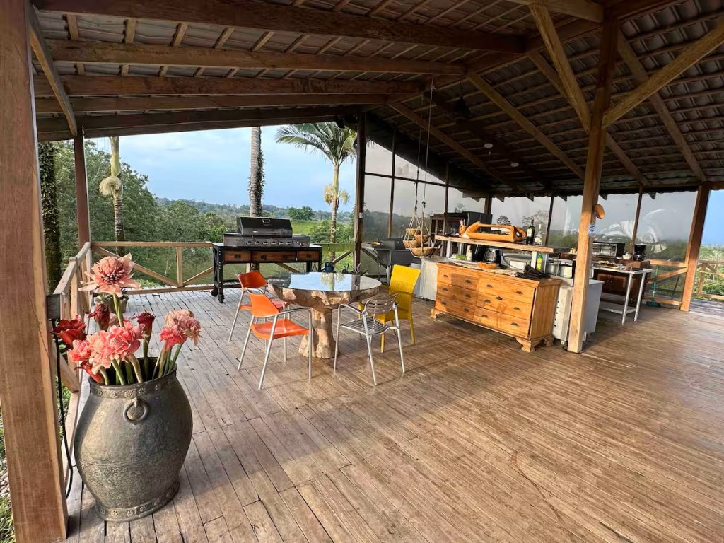 Outdoor kitchen and dining room overlooking Arenal volcano at the Zen Farm
